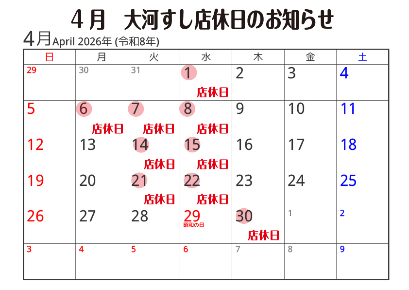 4 072026 今月の定休日 店休日 Post Share Hatena Pocket RSS feedly Pin it 〇4月の店休日【2026年】 ※状況の変化により、変更がある場合がございますので、予めご了承下さい。 〇5月の店休日【2026年】 ※状況の変化により、変更がある場合がございますので、予めご了承下さい。 お弁当はじめました! 前の記事